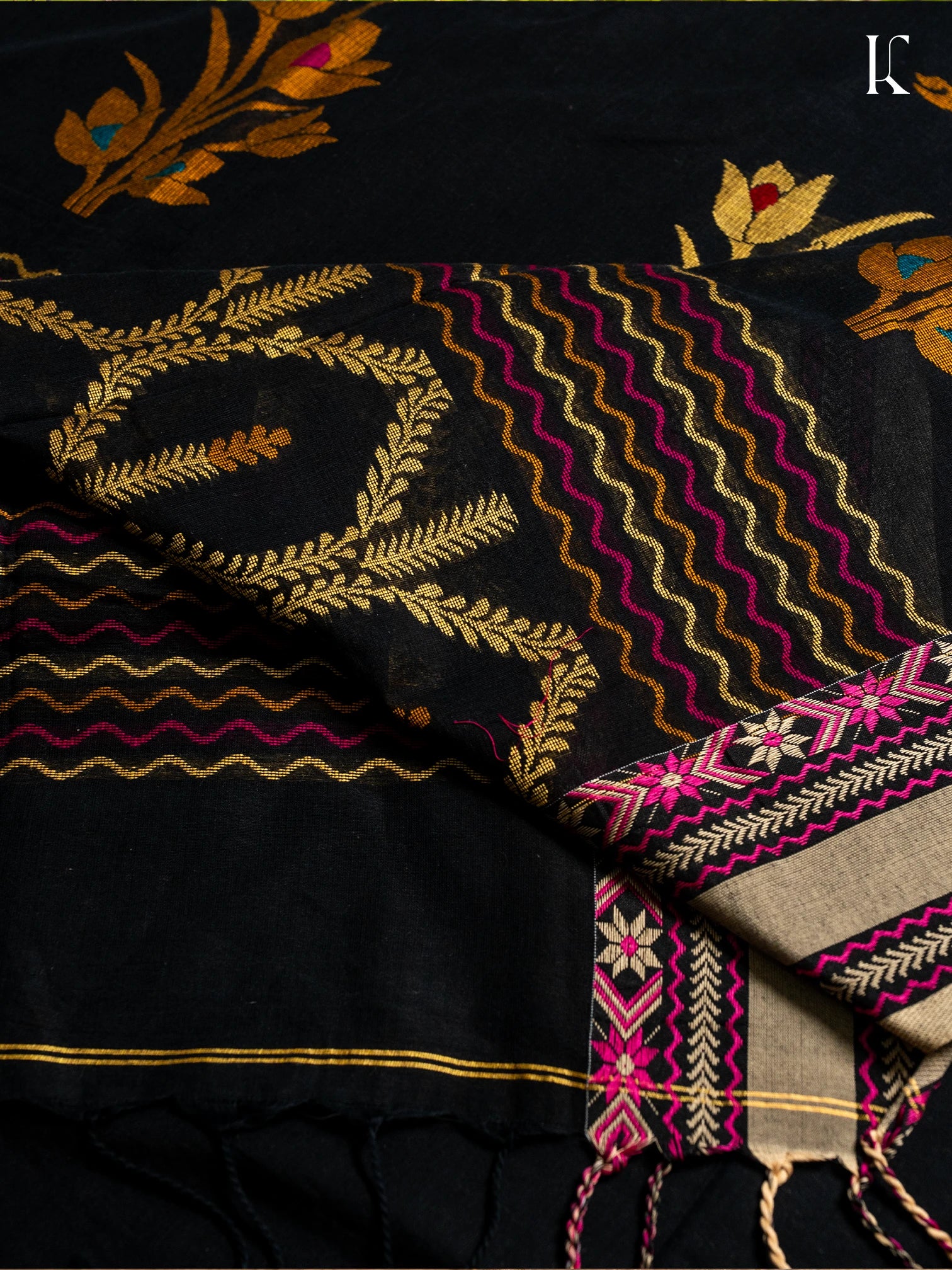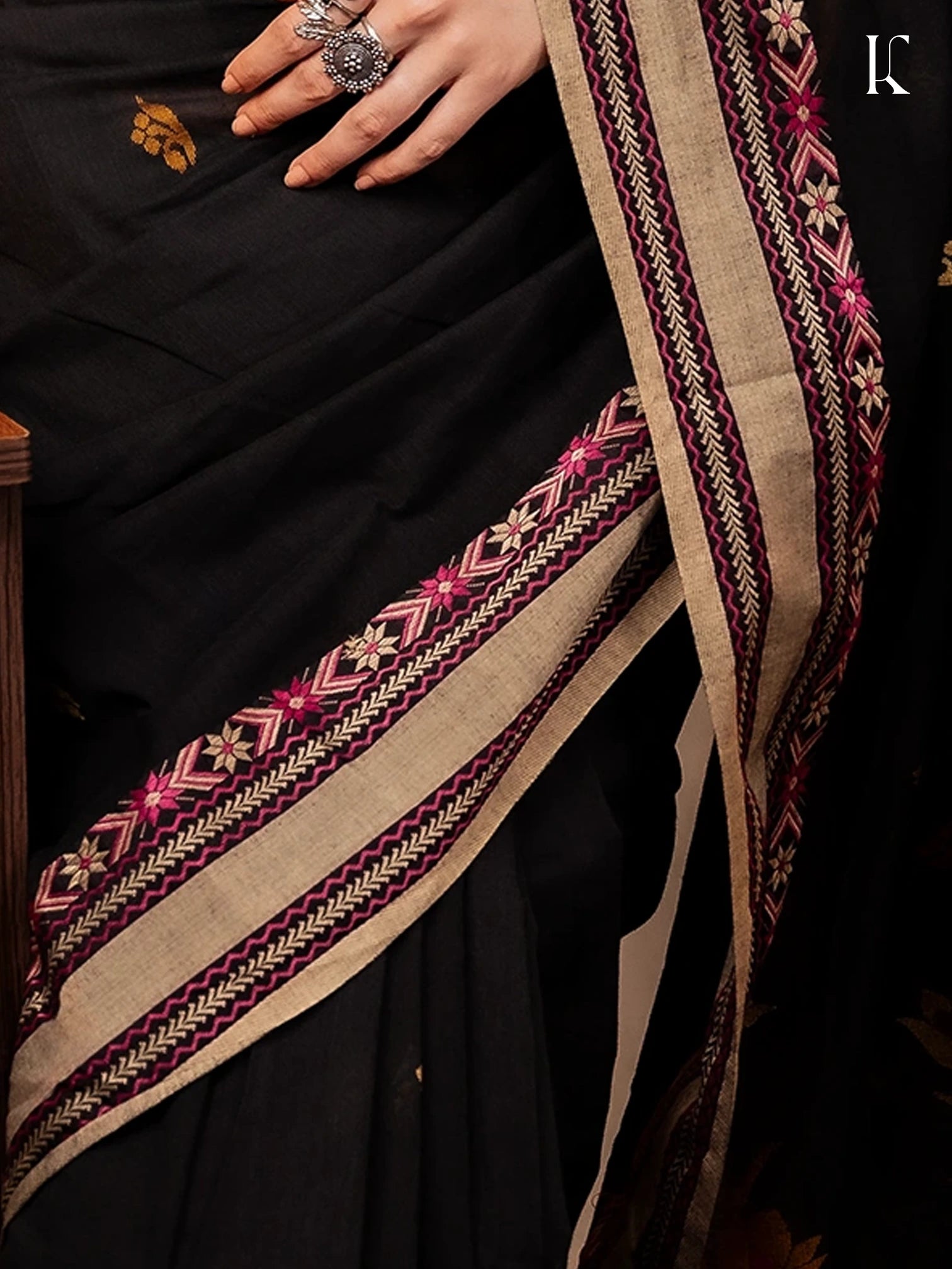 Crafted in soft handloom cotton, Aarambh is a black saree that doesn’t hold back. With structured leafy butis in mustard and magenta forming a rhythmic grid across the body, and a bold wavy palla that adds movement and mood, this piece is both rooted and refreshing. Finished with twisted tassels, it’s perfect for when you want a saree to speak — without having to explain.