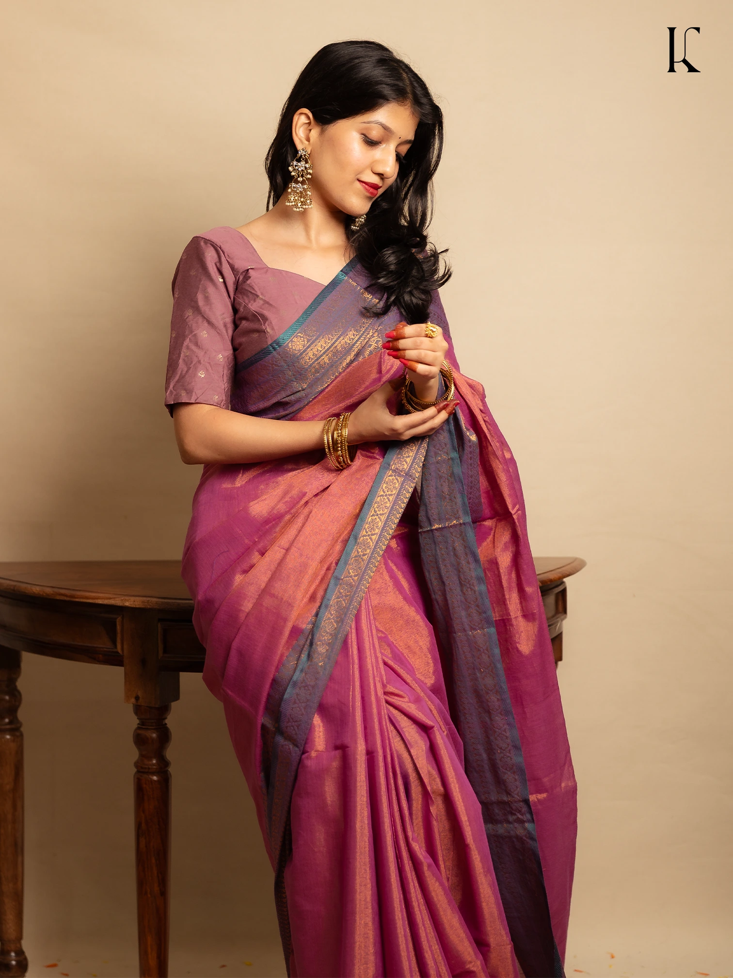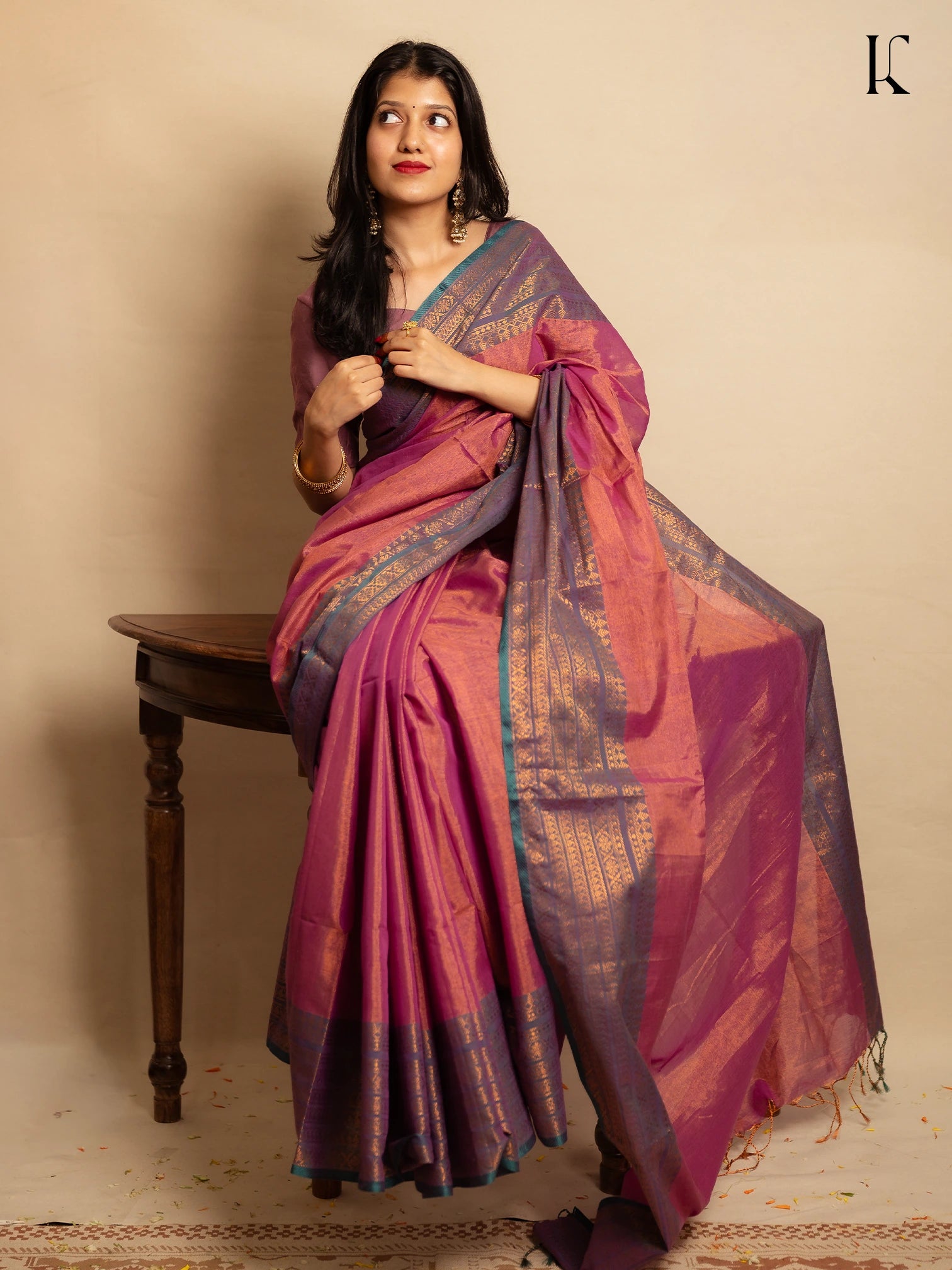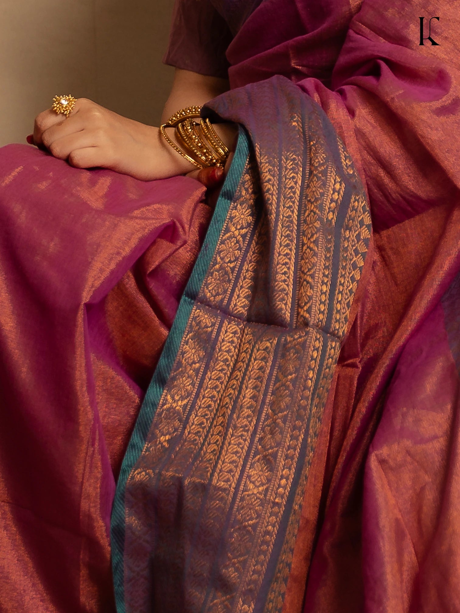 Gulika is a vibrant magenta tissue saree highlighted with violet and gold zari borders. The dual-tone play of magenta and purple brings a festive brilliance that’s equal parts playful and regal.