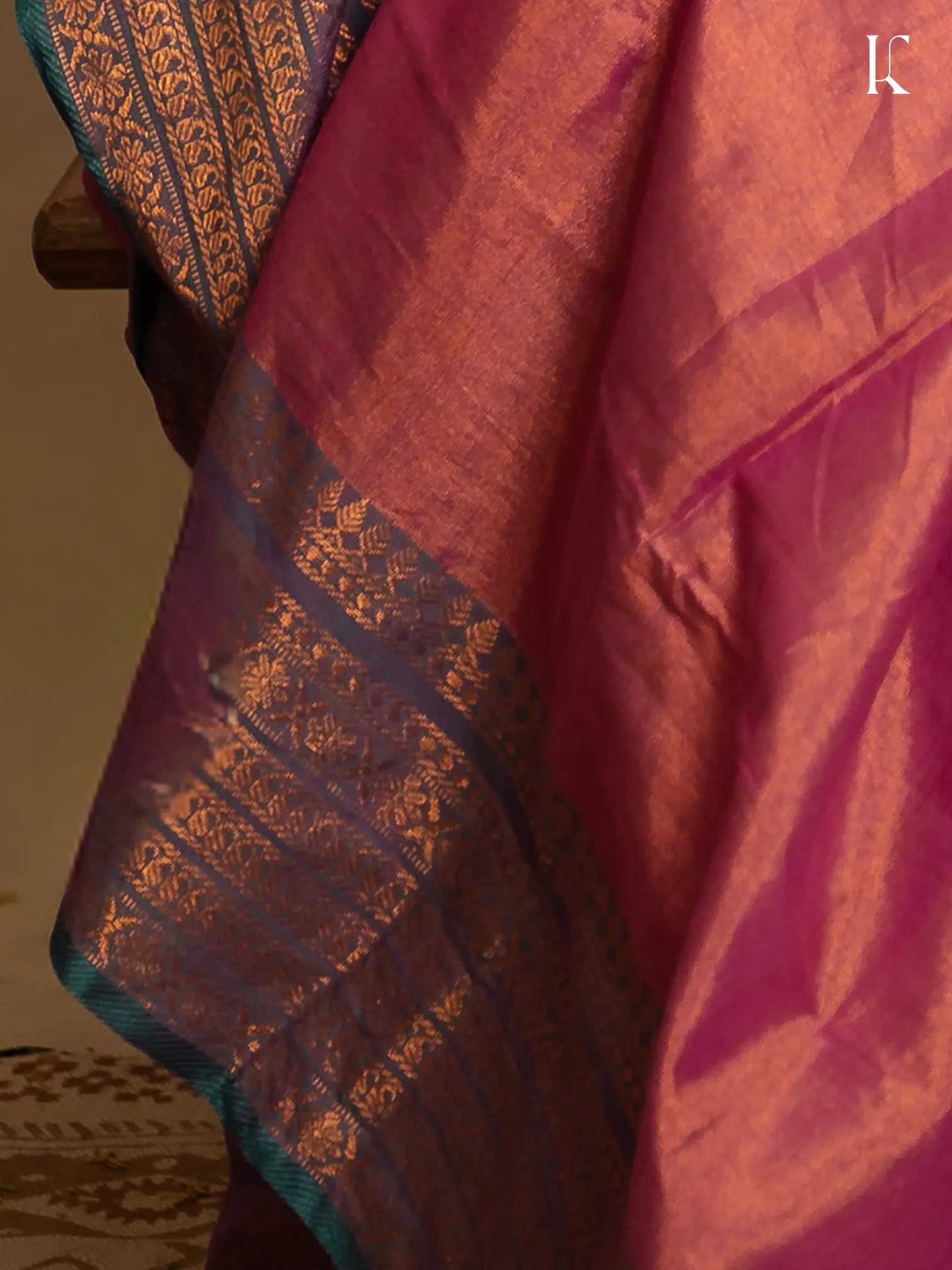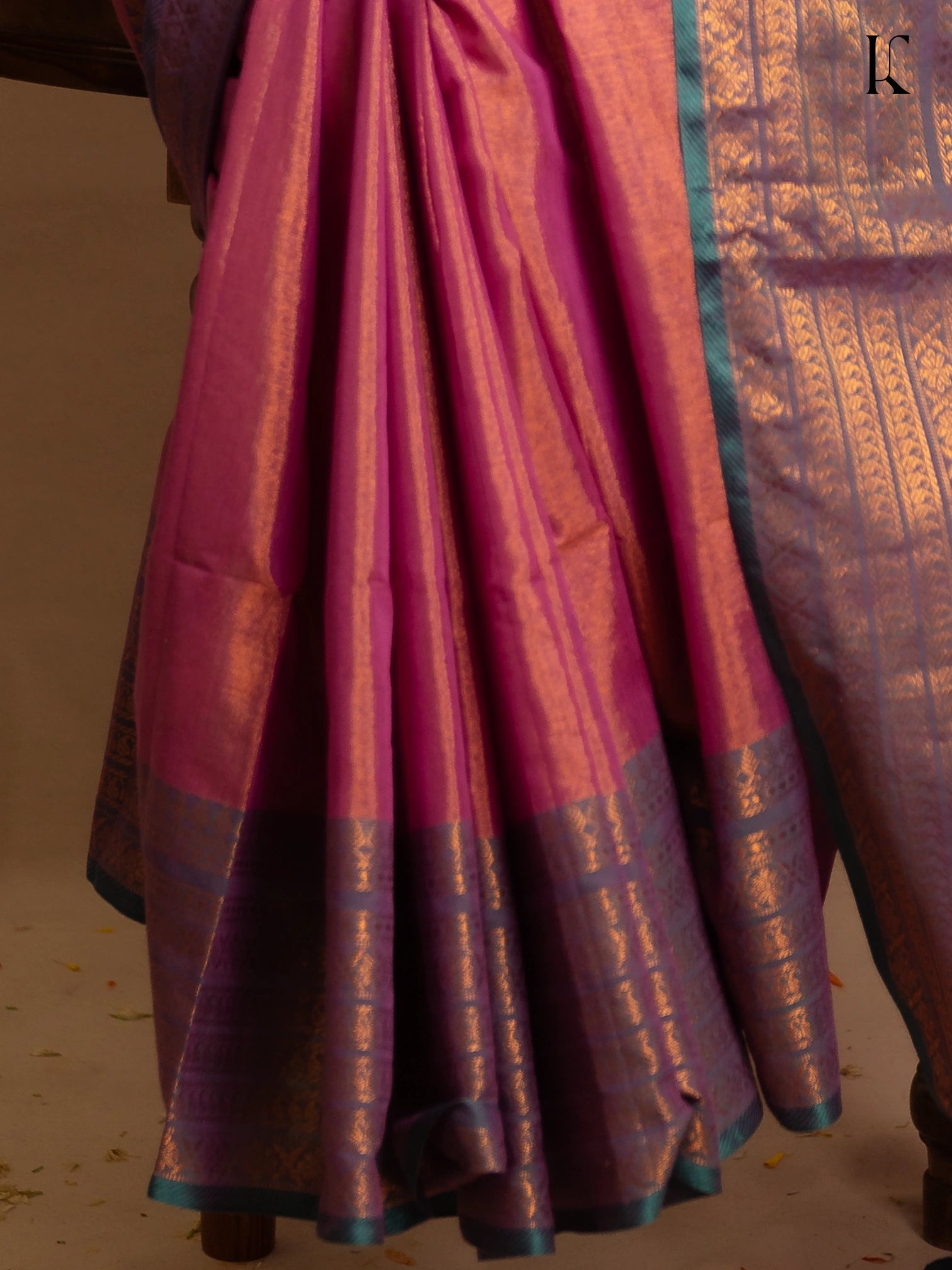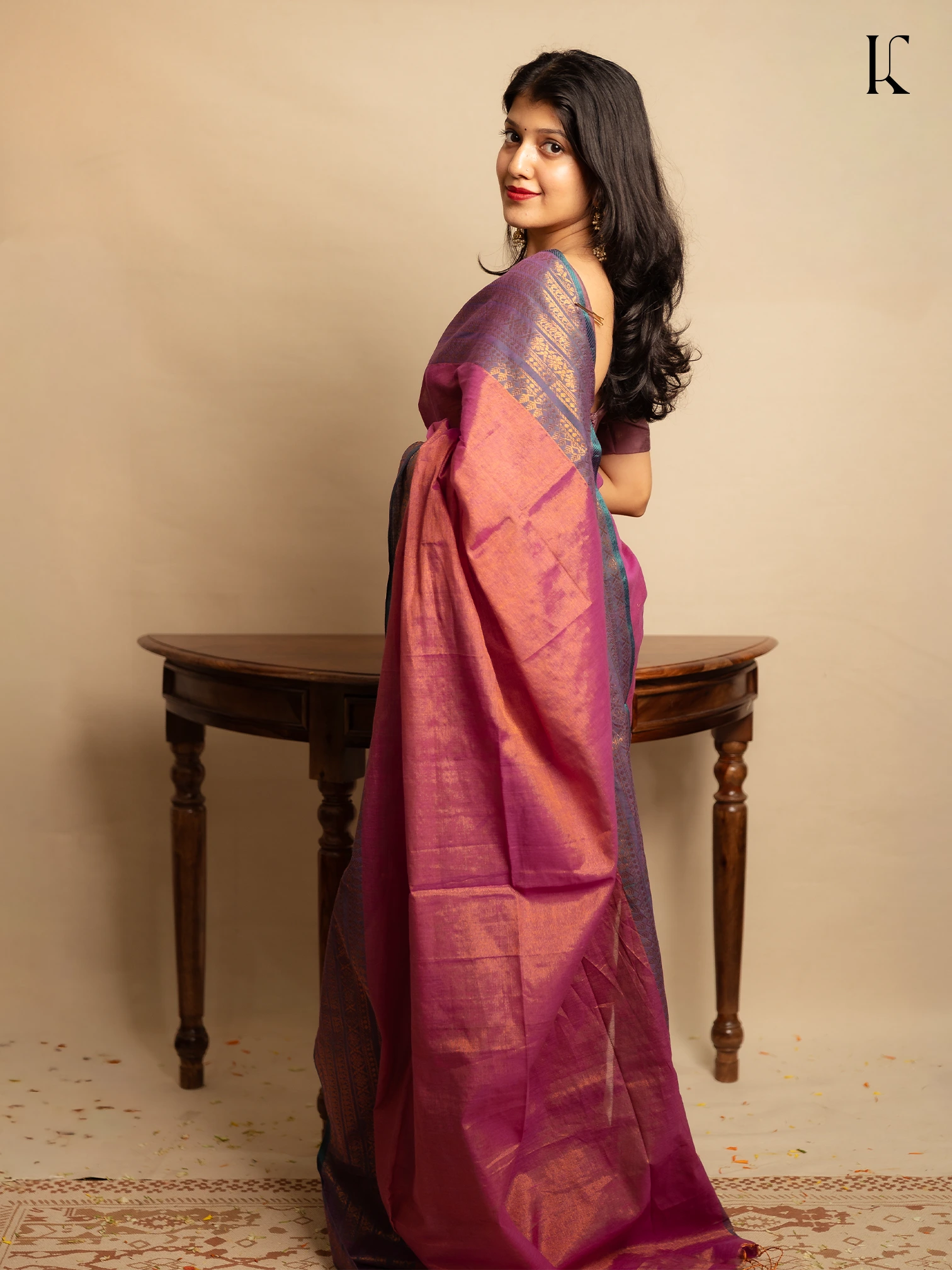 Gulika is a vibrant magenta tissue saree highlighted with violet and gold zari borders. The dual-tone play of magenta and purple brings a festive brilliance that’s equal parts playful and regal.