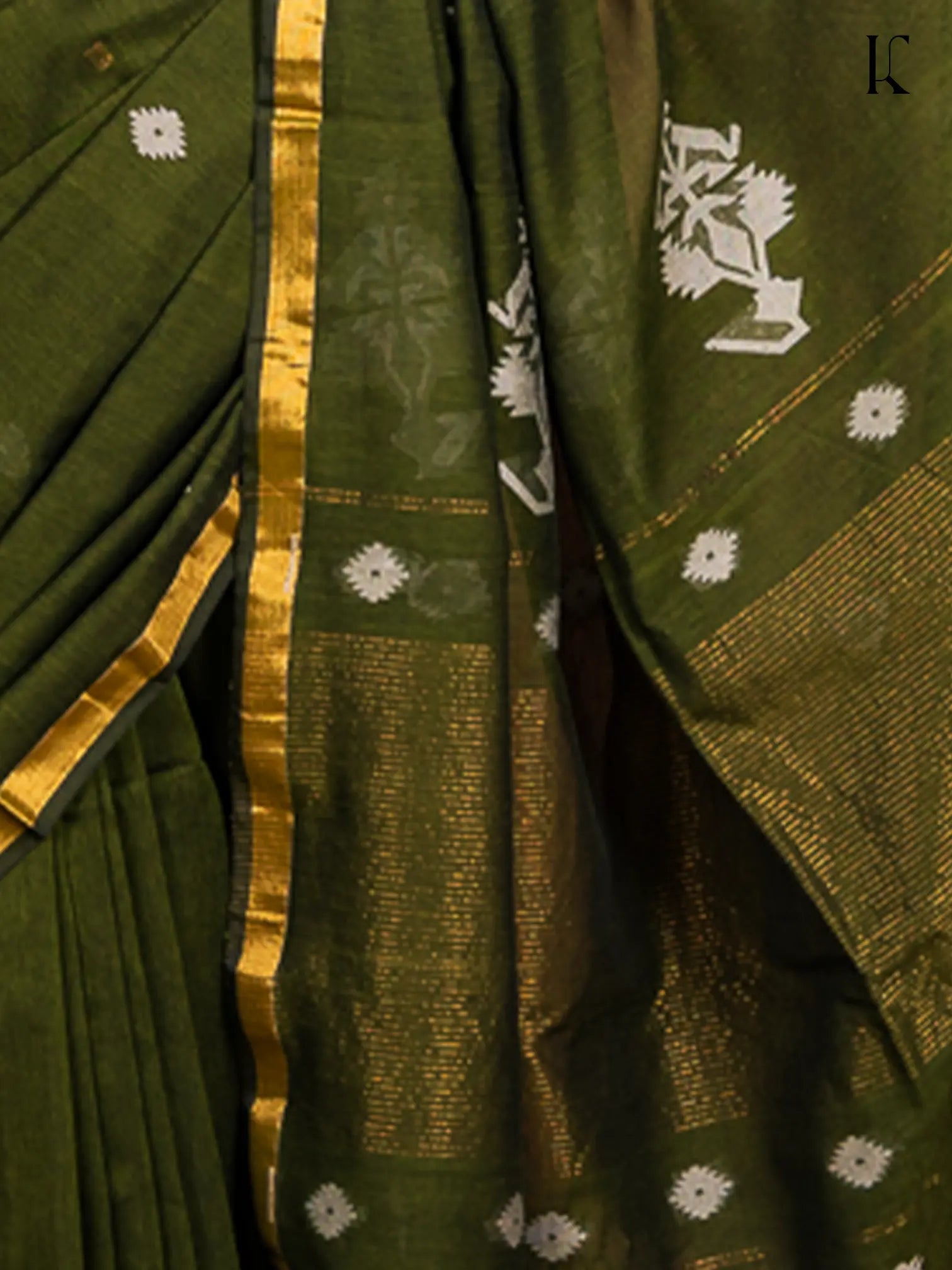 Woven in a rich mehendi green, Maati features ivory tribal-inspired butis that stand bold against a deep earthy base. The golden zari lines running along the borders and palla add warmth and tradition without overpowering the simplicity of the weave. Finished with knotted tassels, this saree feels both rooted and regal — like a walk through an old village in monsoon.