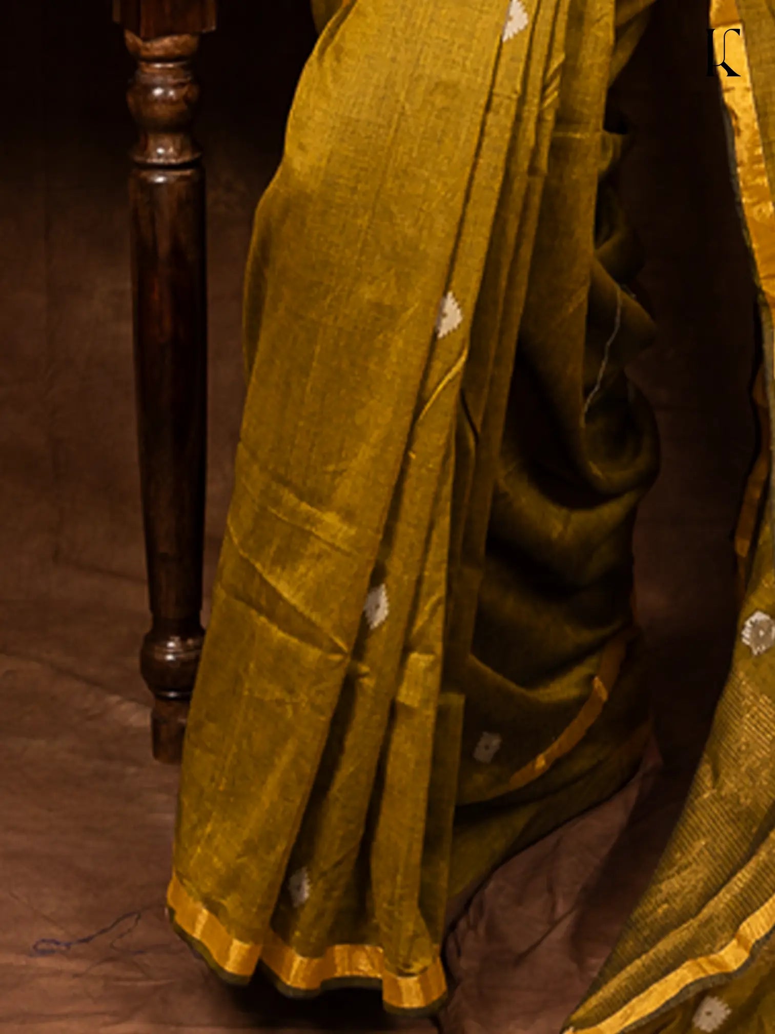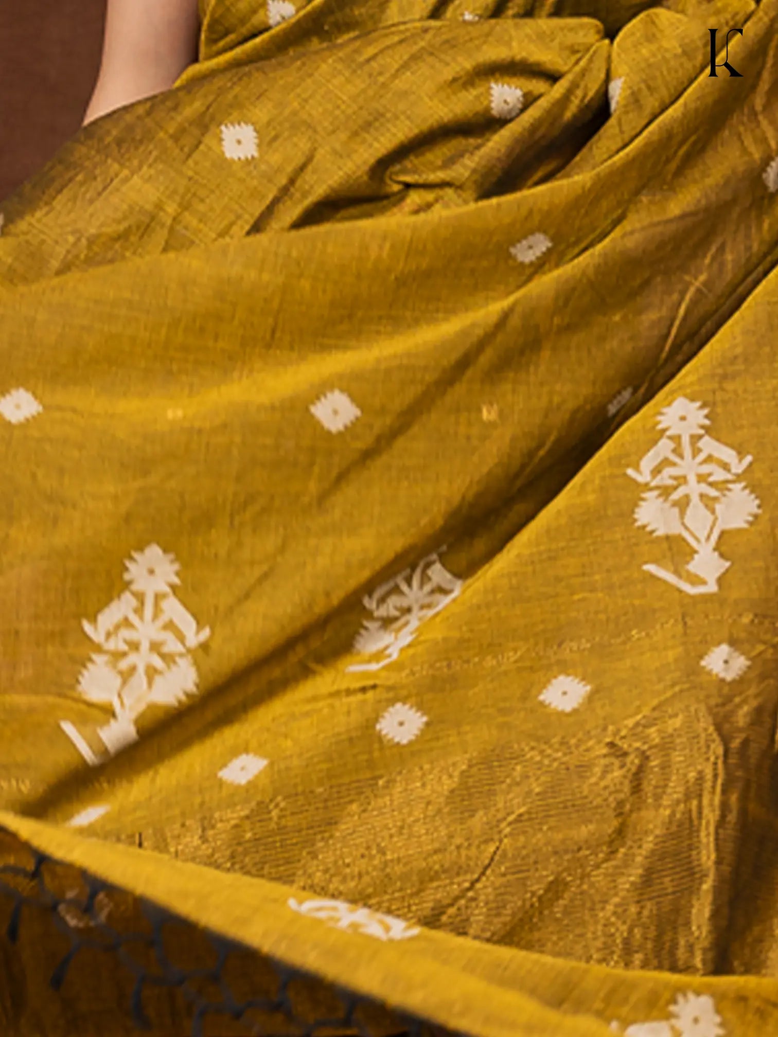 Woven in a soft olive green with minimal ivory tribal motifs, Meher brings a sense of stillness and softness. The understated zari lines add warmth, while the black hand-tied tassels give the saree a grounded finish. Light, breathable, and full of character — it’s a blessing in cotton.