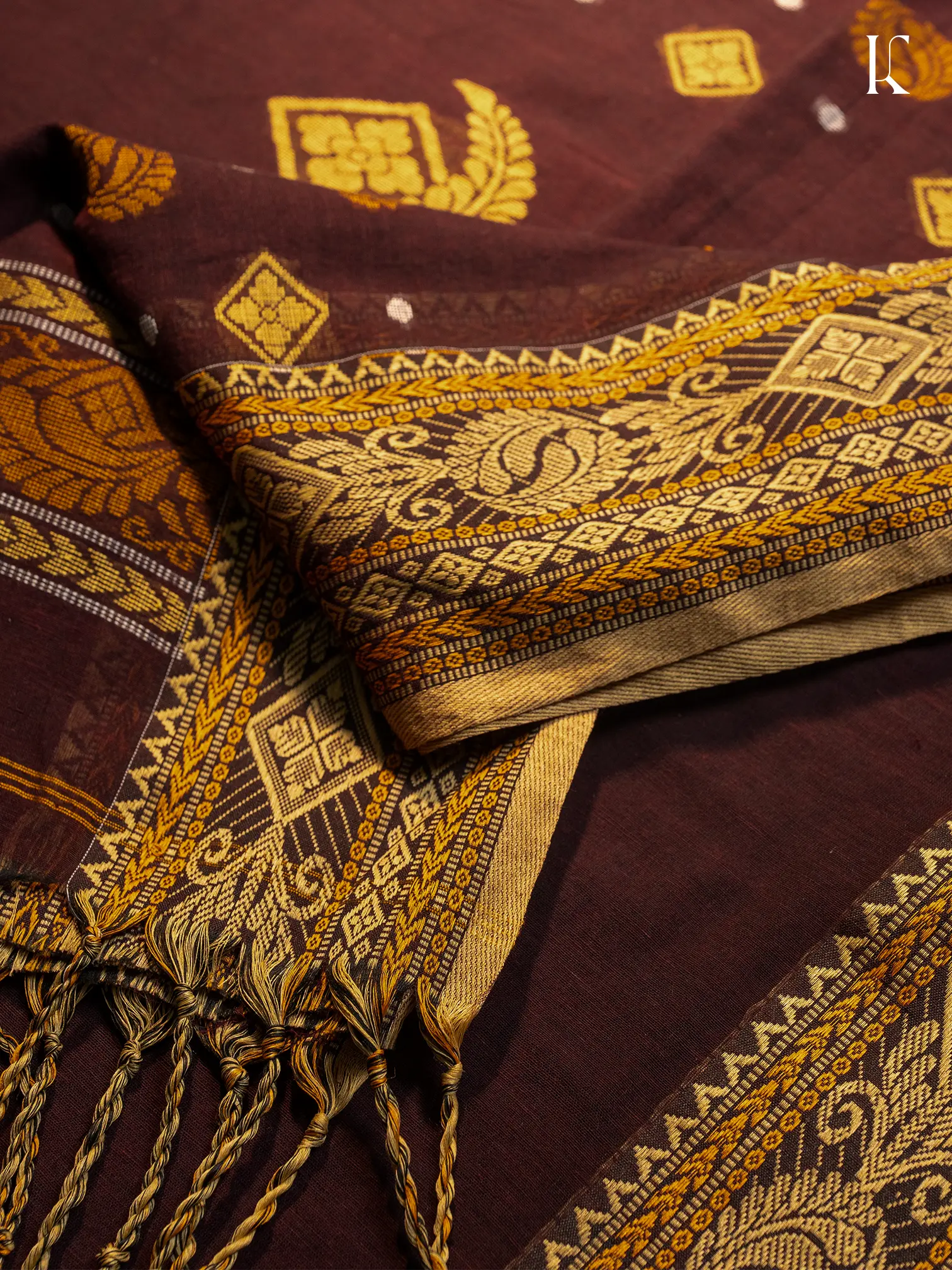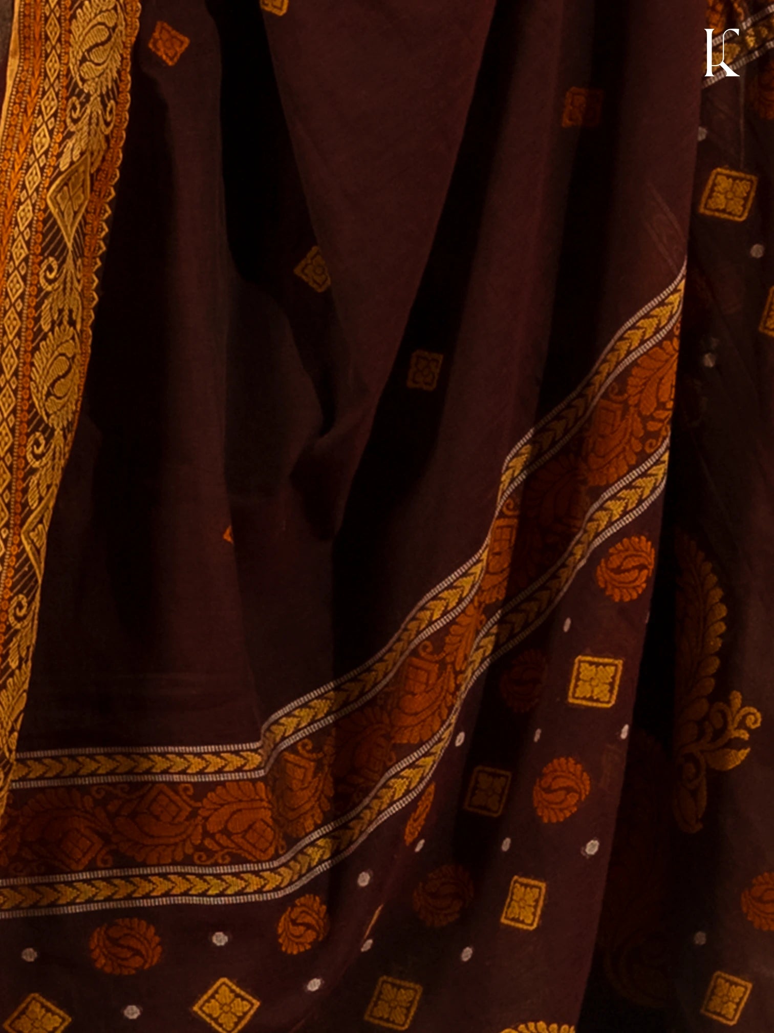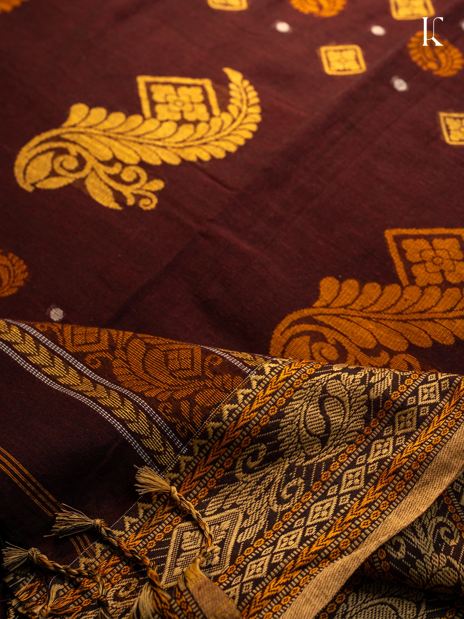 This saree is all about old-school richness. In a rare coke-brown shade, it features gold-toned paisley and diamond motifs across the body, punctuated with small silver accents for contrast. The ornate border, woven with floral vines and traditional design language, brings in a regal touch. Finished with delicate tassels, this piece blends cultural heritage with everyday wearability.