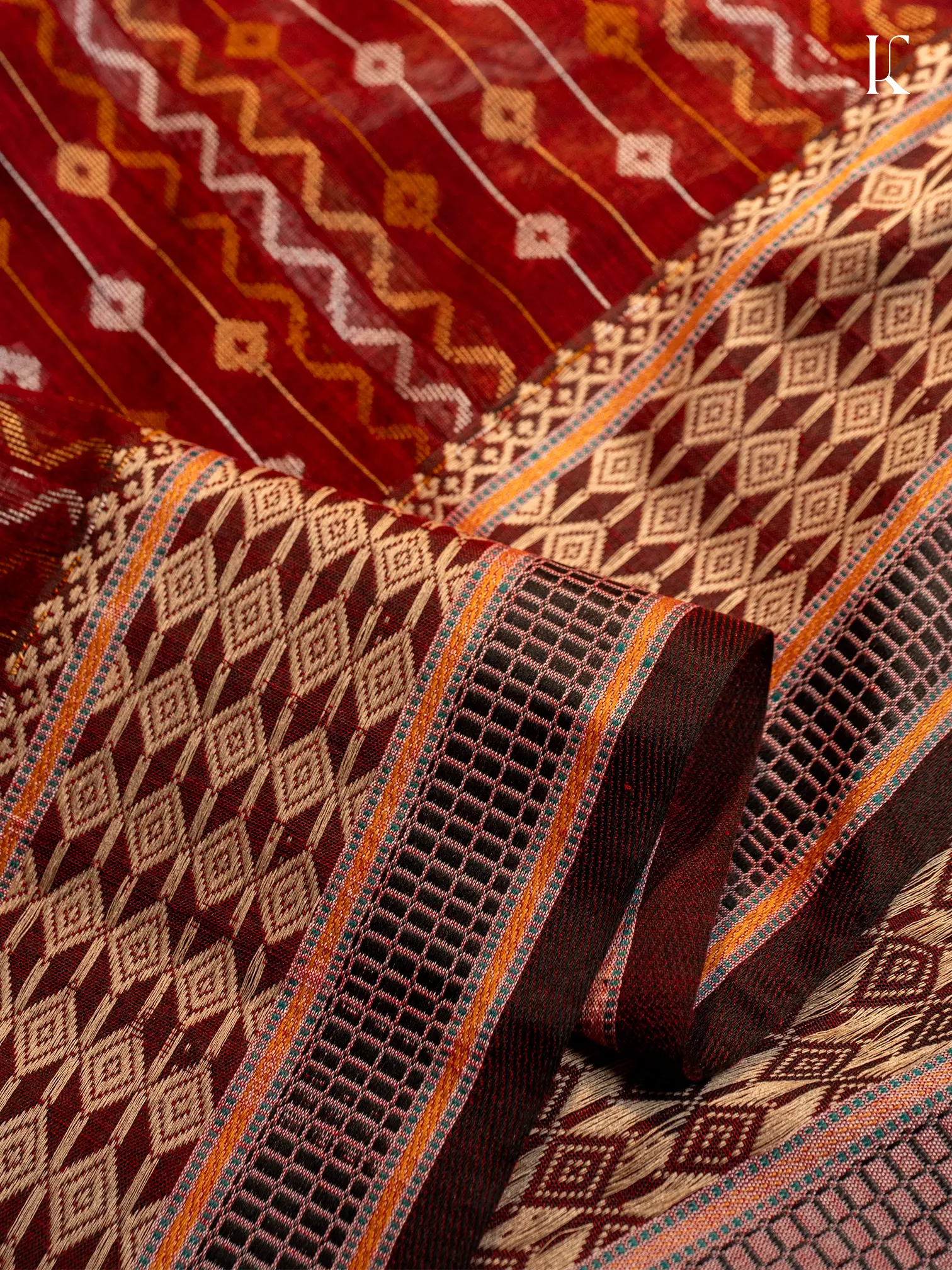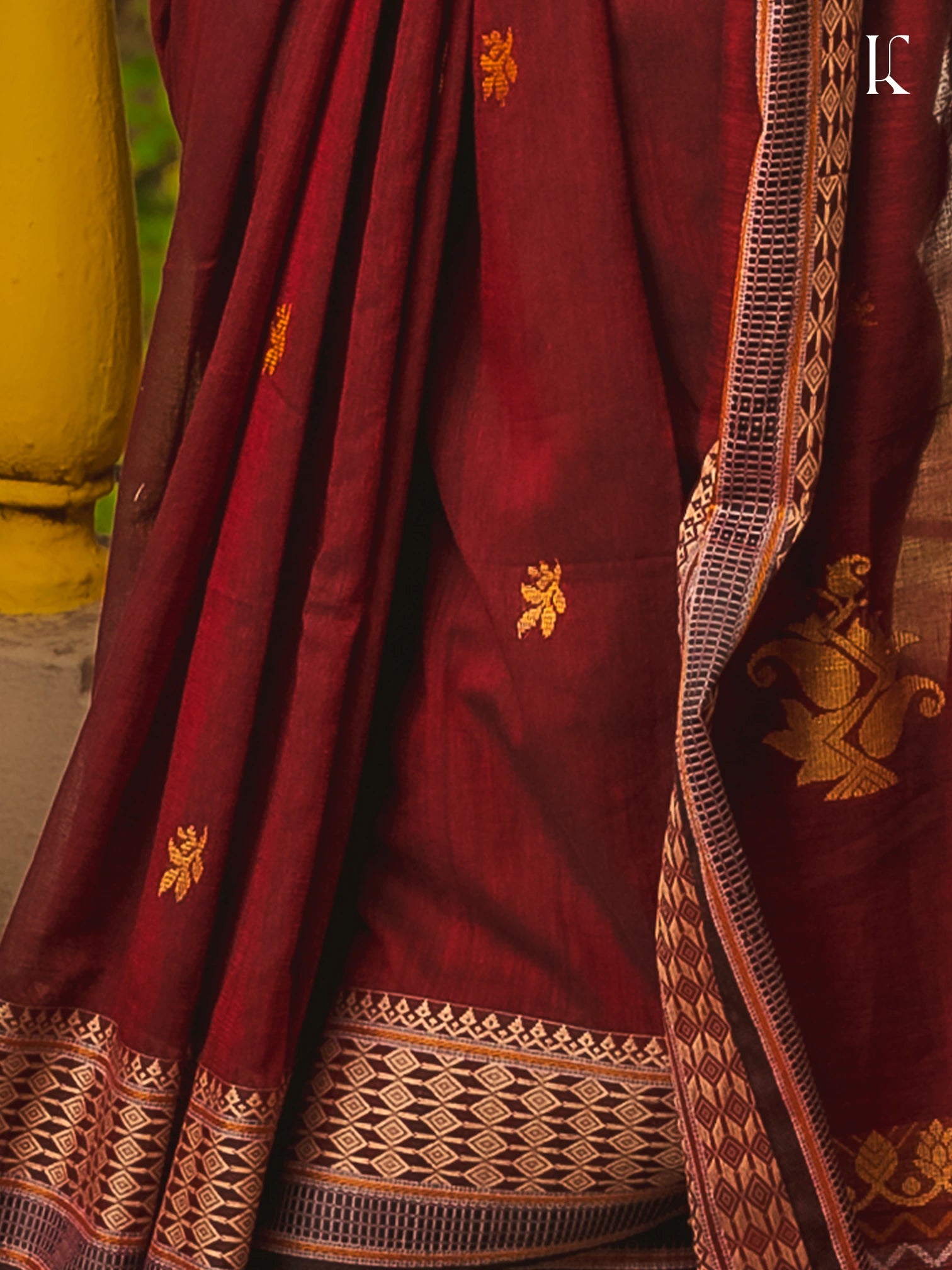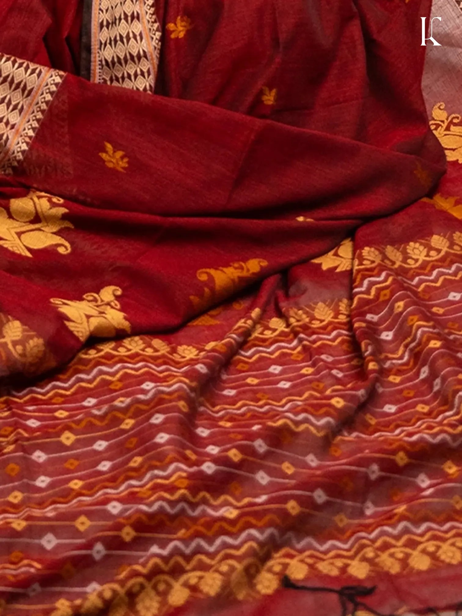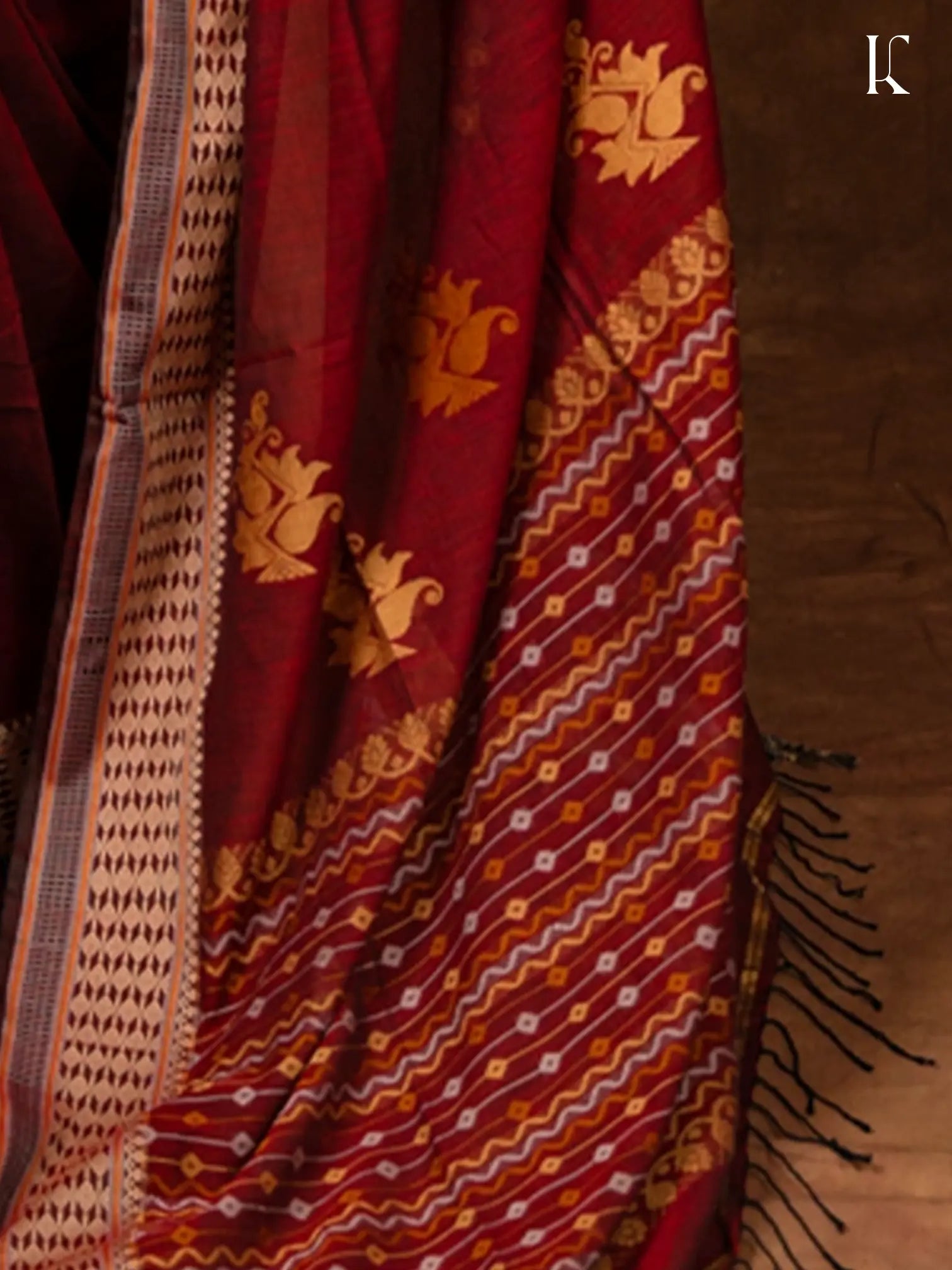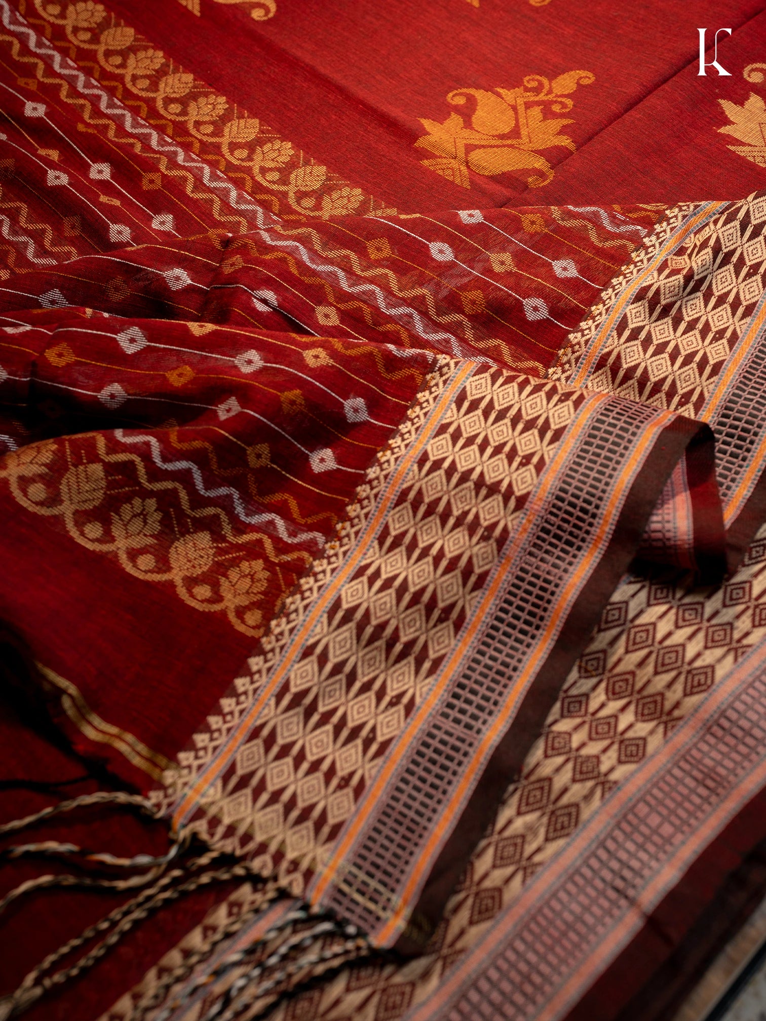 In a deep rust-red hue, Ruhani features oversized floral butis in warm golden tones, woven on soft handloom cotton. The palla is lined with rhythmic patterns and lotus-like vines, evoking festive heritage. It's light, breathable, and effortlessly regal — made for celebrations, quiet or grand.