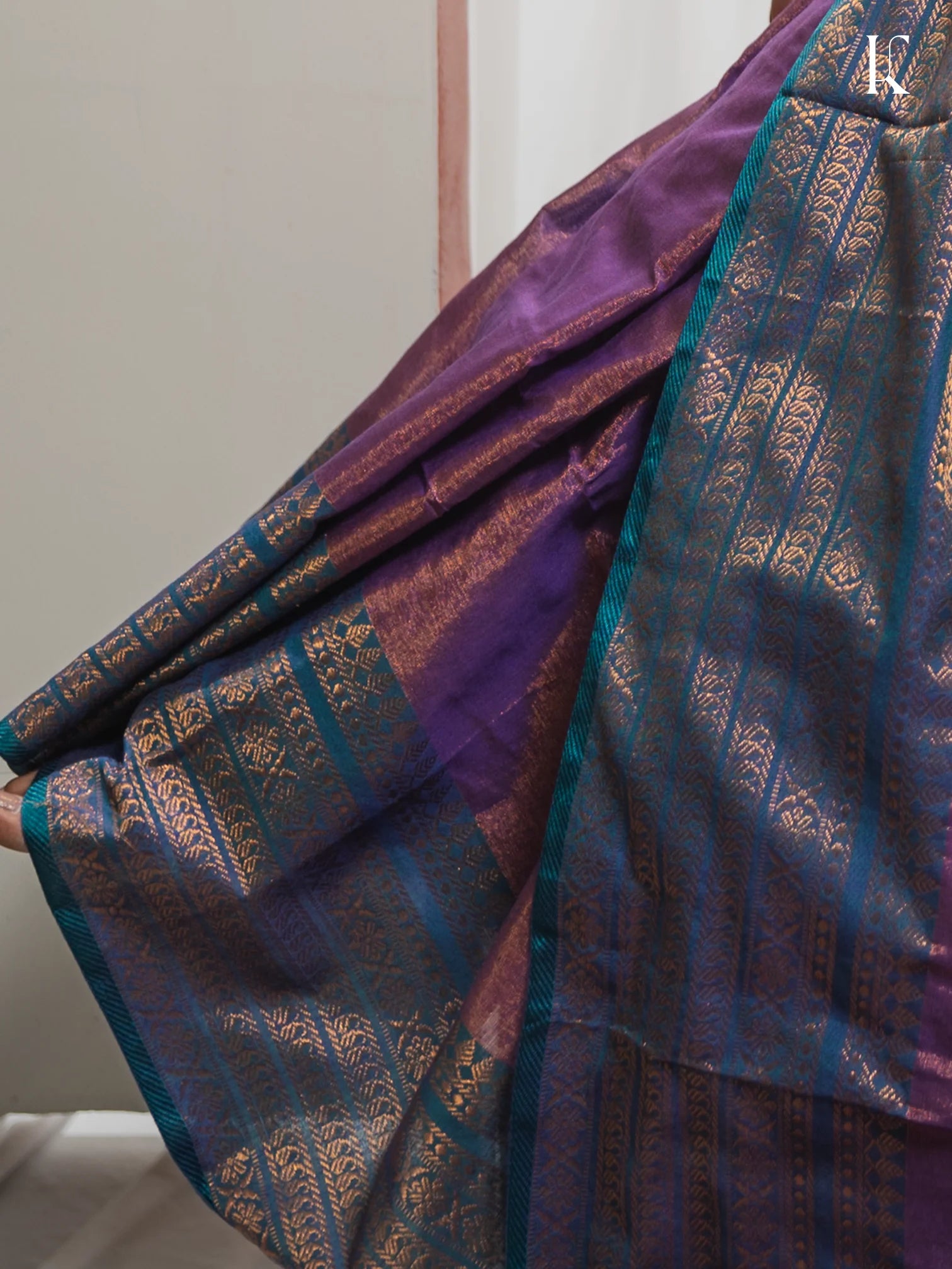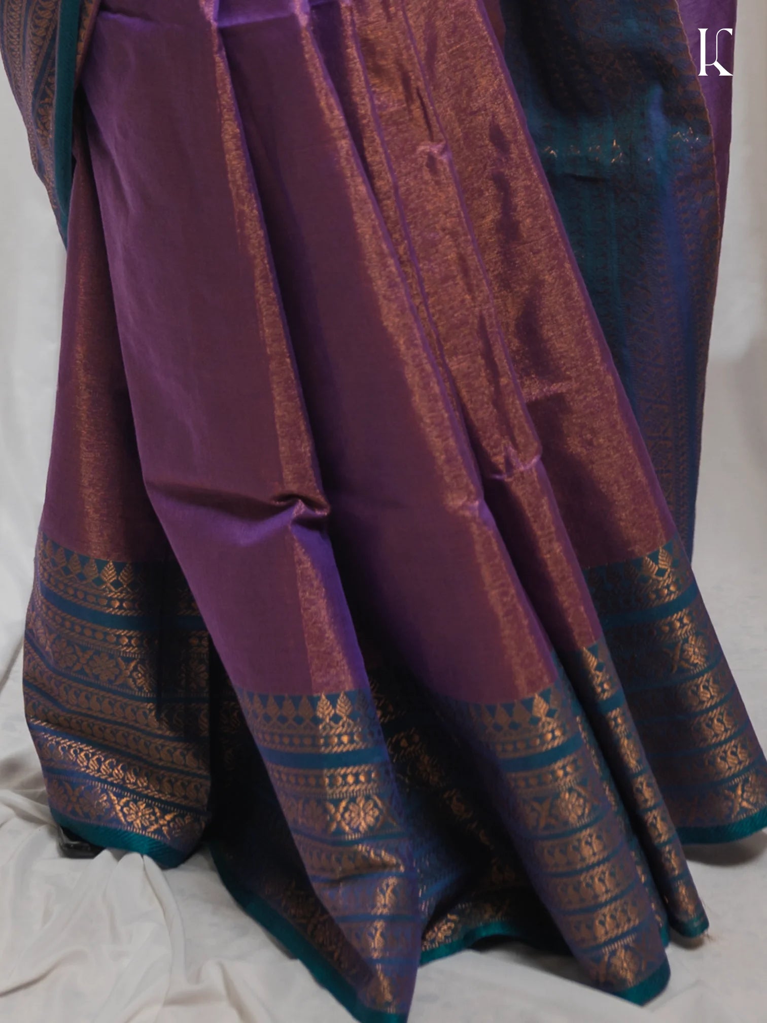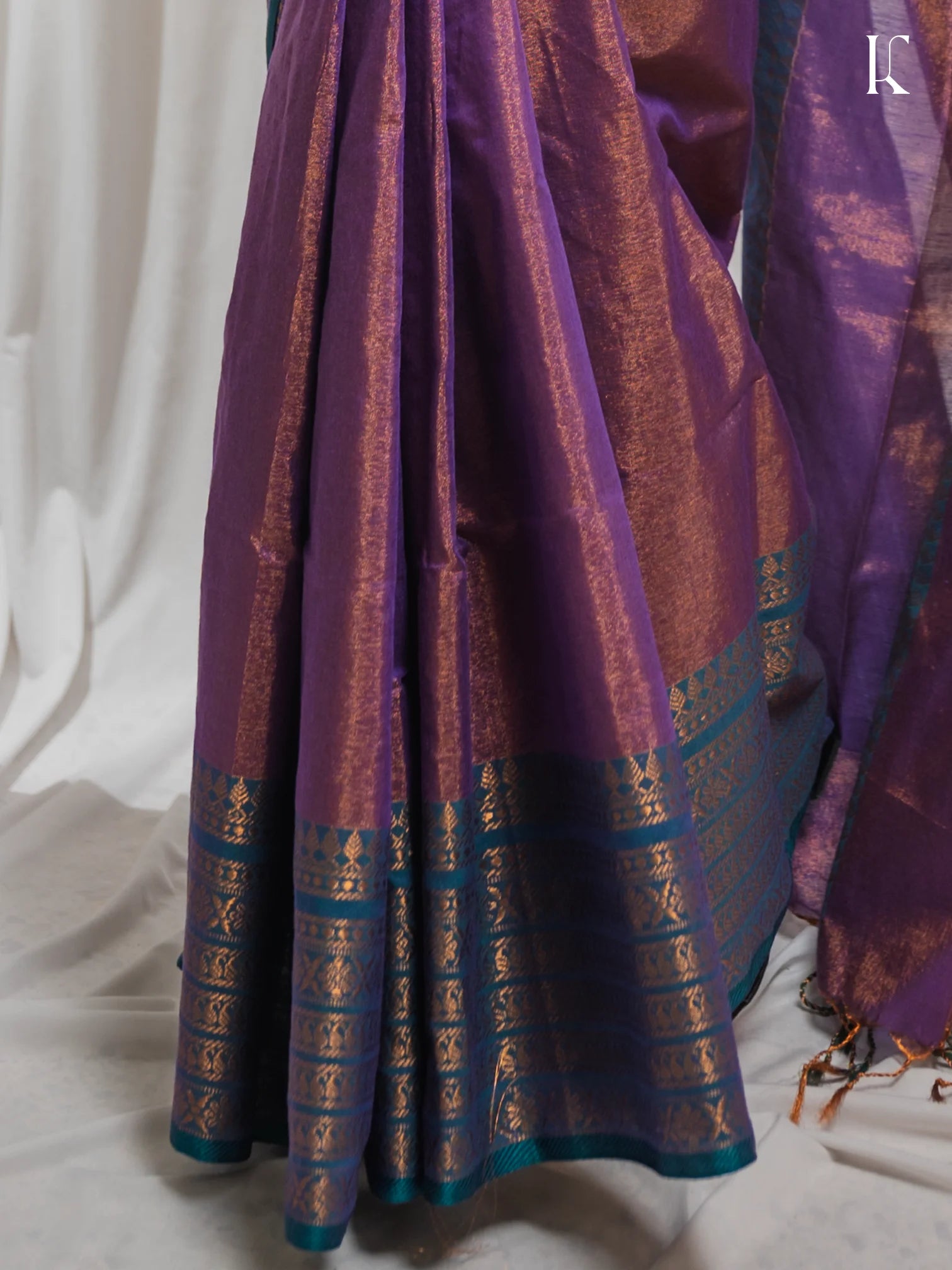 Tarangini combines the richness of purple with the calm of teal, highlighted with intricate golden zari work. The tissue weave gives it a soft sheen, making it ideal for weddings, festive evenings, or family gatherings where tradition meets subtle luxury.